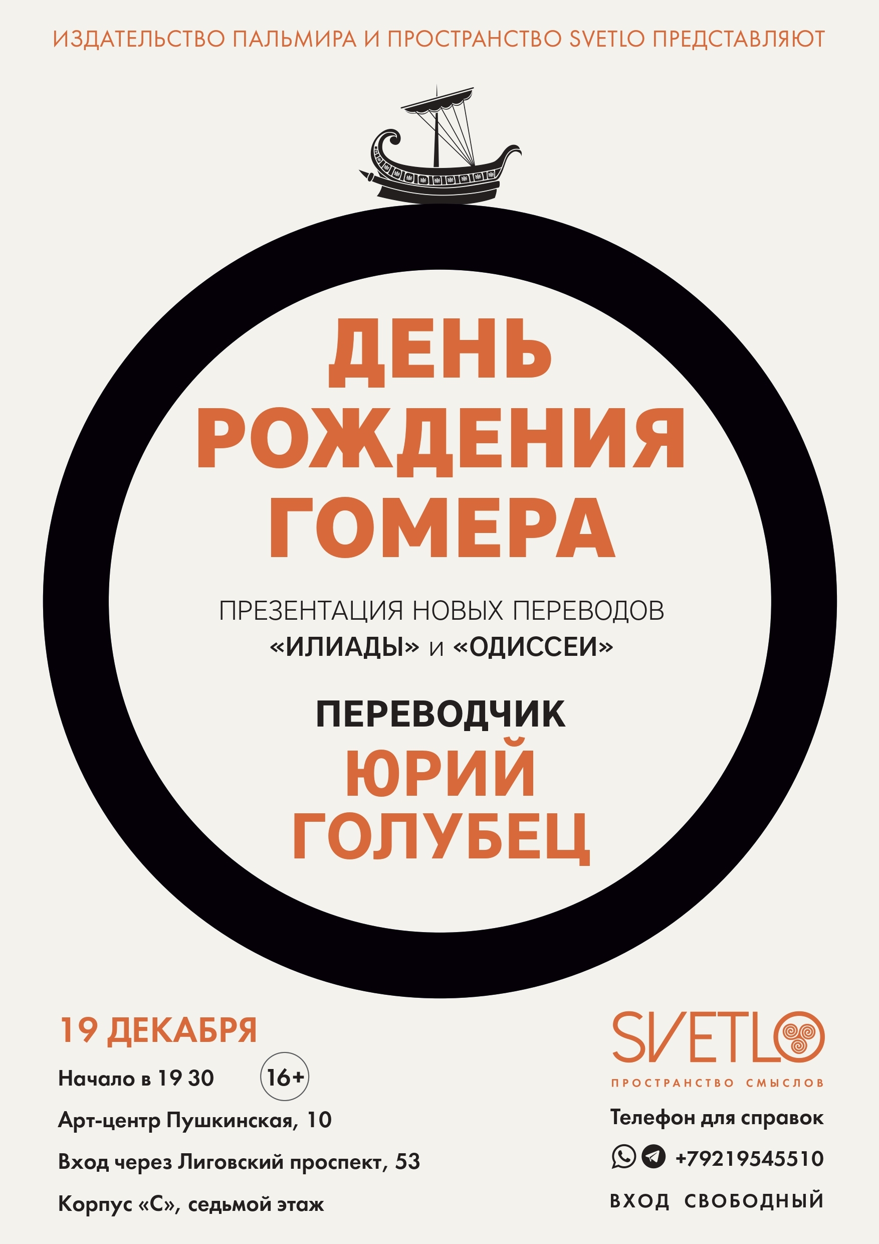 На праздник приглашают издательство «Пальмира» и пространство “SVETLO”! Приходите отметить рождение поэта (жил он не то в IX-м, не то в VIII‒VII веках до нашей эры, правда — жил ли, доподлинно не установлено) разговором о новых переводах «Одиссеи» и «Илиады». Автором их стал Юрий Голубец, тоже поэт, а также писатель, переводчик стихотворений, художественной и научной прозы с французского, английского, немецкого и древнегреческого. Среди последних тексты Горация и Катулла, Овидия, Нонна Панополитанского, Проперция и Феогнида.