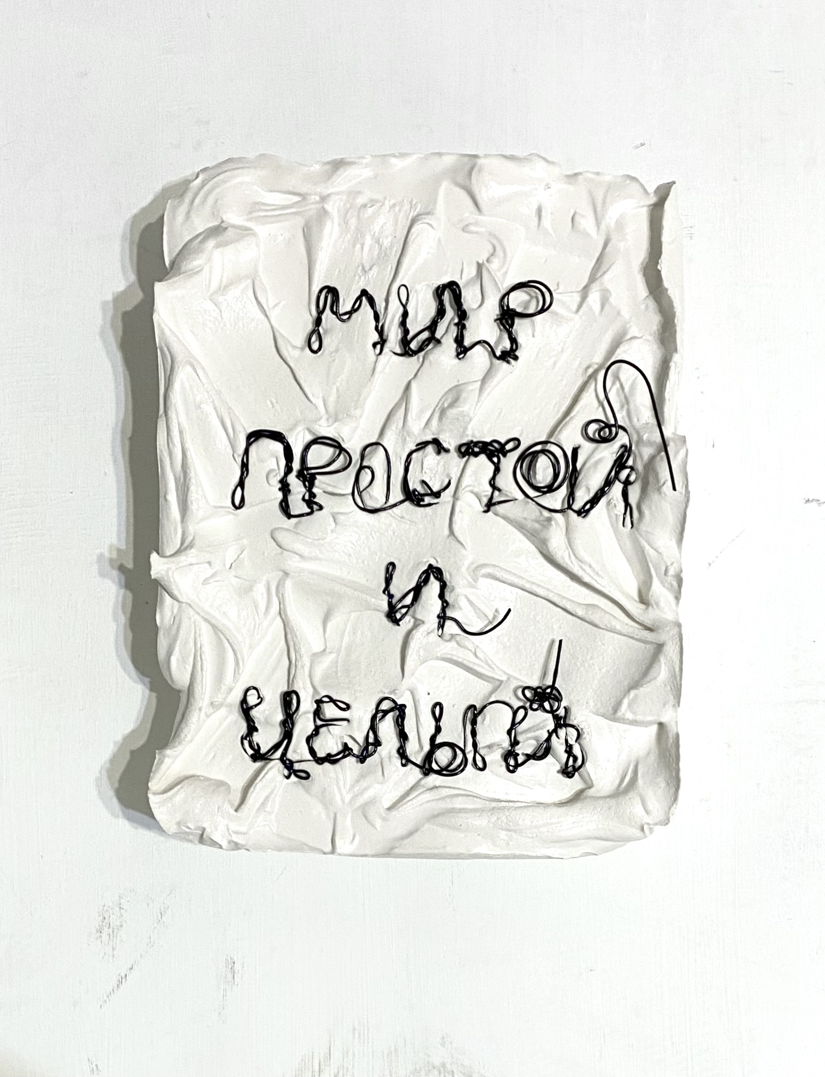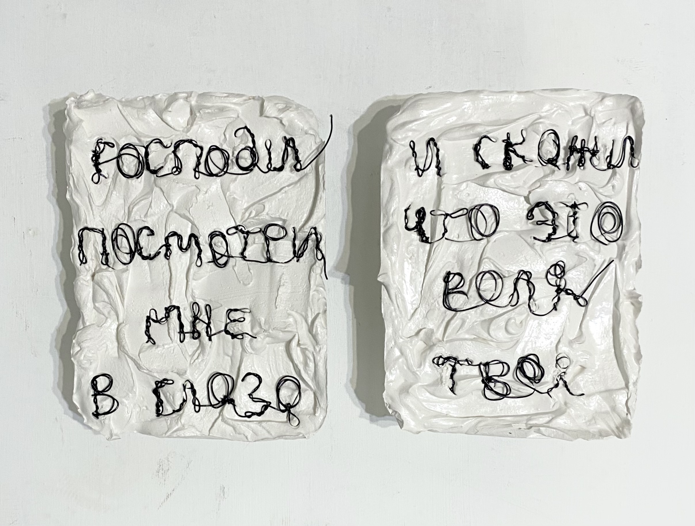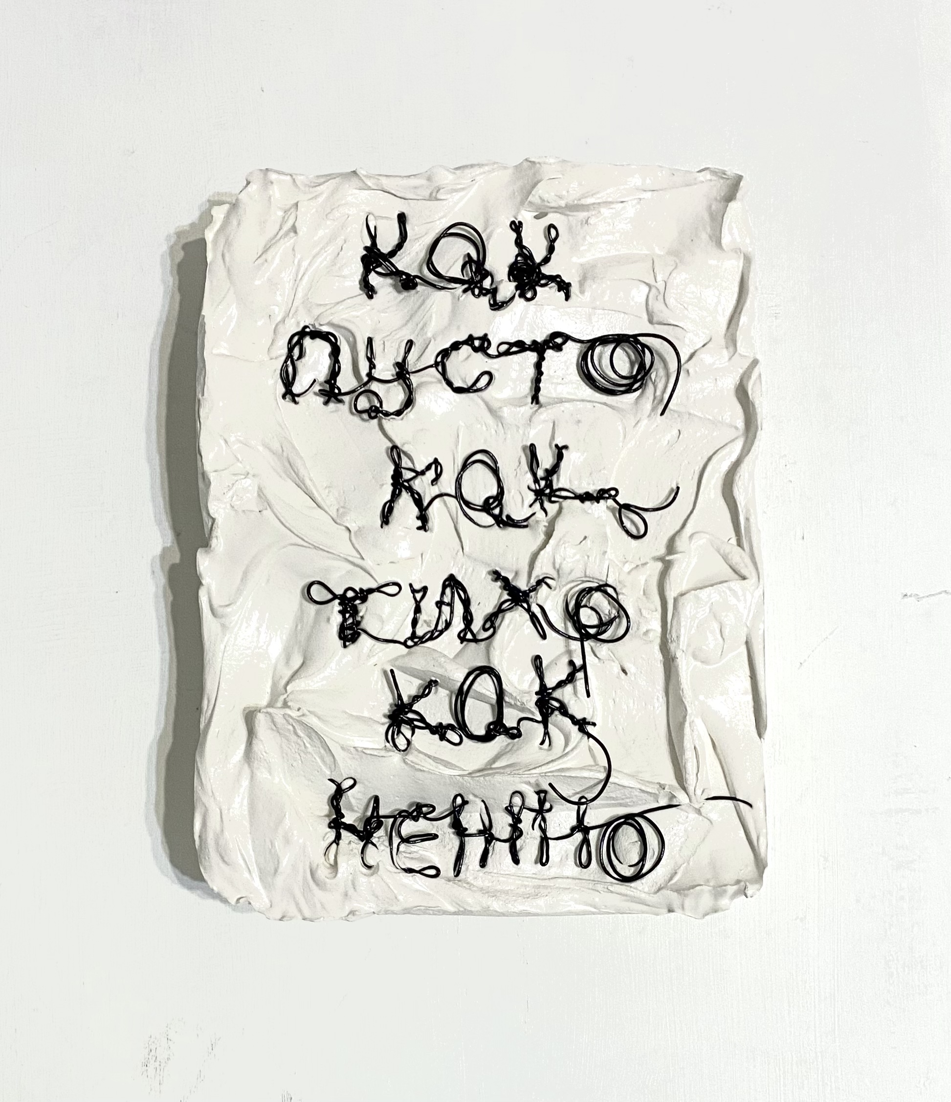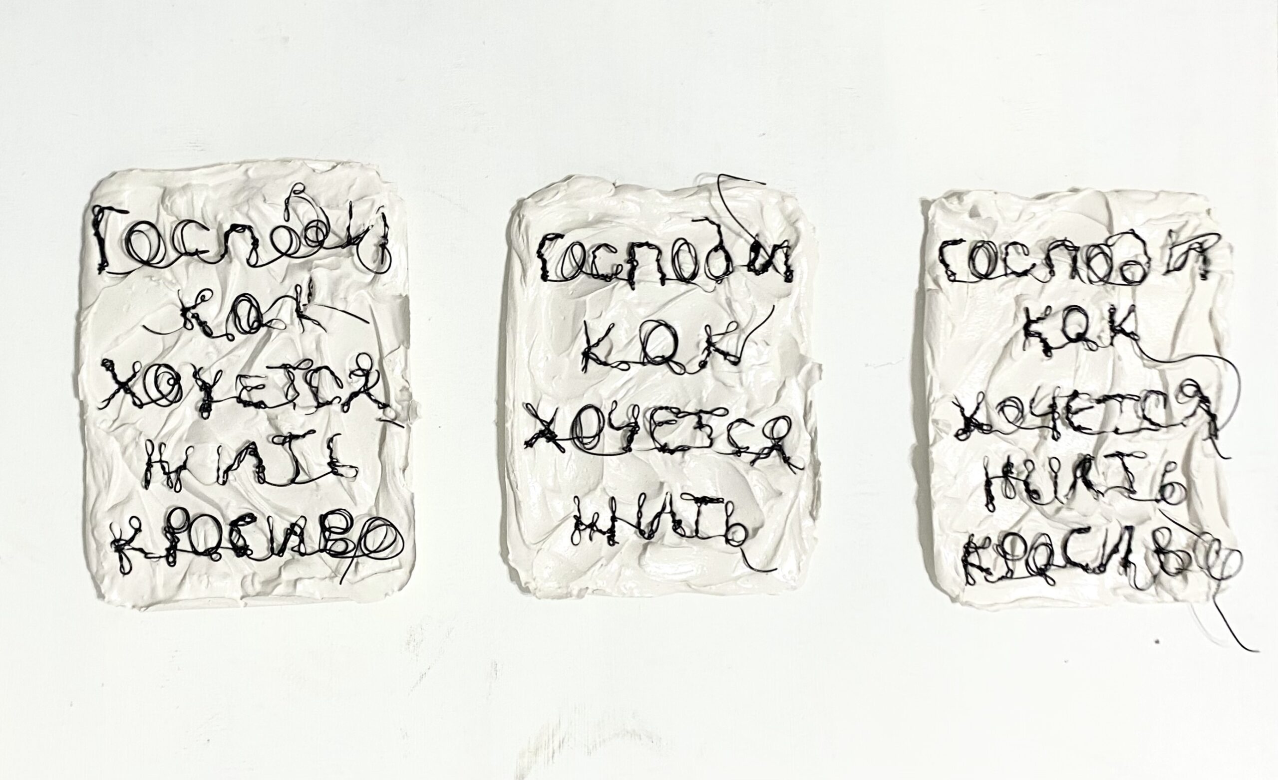 Переосмысляя традицию «персональной песни» через материальную форму, Татьяна создает собственный лингвистический архив, где личность зашифрована в аутентичном текстовом артефакте. Твердая, тактильная фактура гипса контрастирует с гибкостью и пластичностью проволоки. В безурядье мерцают фрагменты личной истории художницы. В этом диалоге медиумов и обрывках строк, в тишине, возможно услышать пробуждение непостижимого…