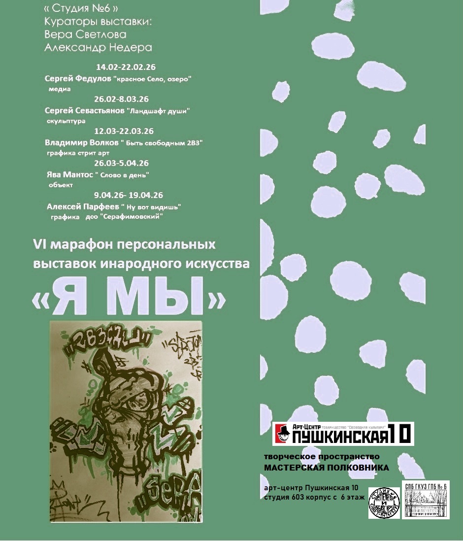 «Студия№6» представляет VI Марафон персональных выставок инародного искусства «Я Мы». Ранее Выставочный Марафон «Я Мы» был также показан в Мастерской Полковника в 2018, 2020 и 2022, 2023 2024 году. Цель кураторского проекта специалистов по социальной работе, художественных руководителей «Студия№6» Веры Светловой и Александра Недера показать живой художественный практикум незагруженный художественными школами и институциями. Формат марафона, где в чередующих одна за другой выставки позволяет воочию исследовать неоднозначный, непосредственный и свободный от включенности в арт – истеблишмент изобразительный язык. Заметим что, будучи в основном исключенное из масс- медийных механизмов такое творчество более привычно в замкнутом пространстве, однако при создании произведении используются схожие стратегии популярные в contemporary art. А потому марафон «Я Мы» скорее будет бесценным событием не только для безусловно необходимой социализации русского outsider art а, также как повод о многом задуматься современному профессиональному художественному сообществу.В VI «Я Мы» представлены работы художников – резидентов