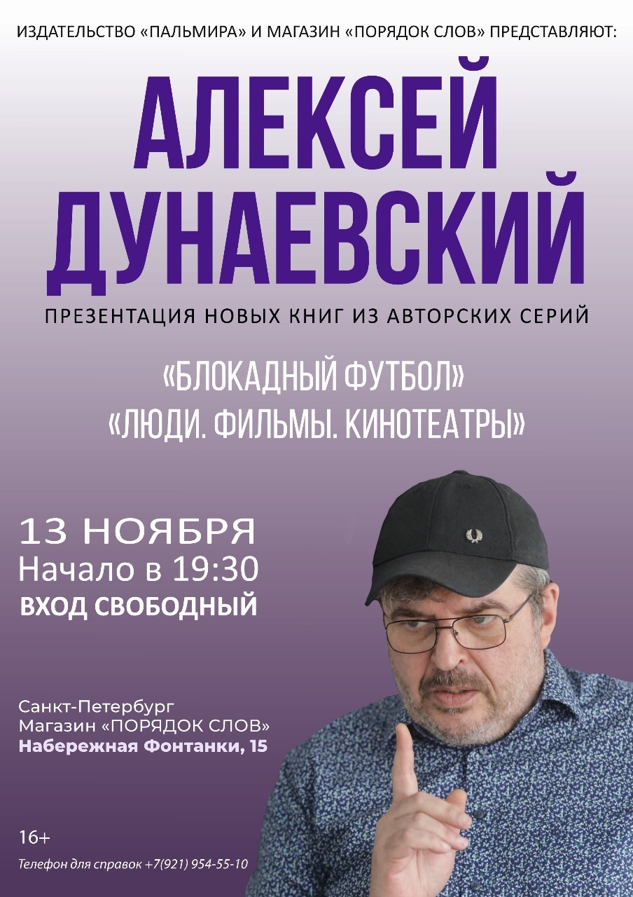Резидент арт-центра издатель Вадим Назаров организует в ноябре вне пространства “SVETLO” на «Пушкинской-10» несколько литературных событий со свободным входом. 13 ноября состоится презентация книг из серий «Блокадный футбол» и «Люди. Фильмы. Кинотеатры» Алексея Дунаевского — историка, киноведа, писателя. «Каждая книга Алексея Дунаевского — это каскад исторических и краеведческих открытий». Вадим Назаров На 20 ноября запланированЧитать дальше